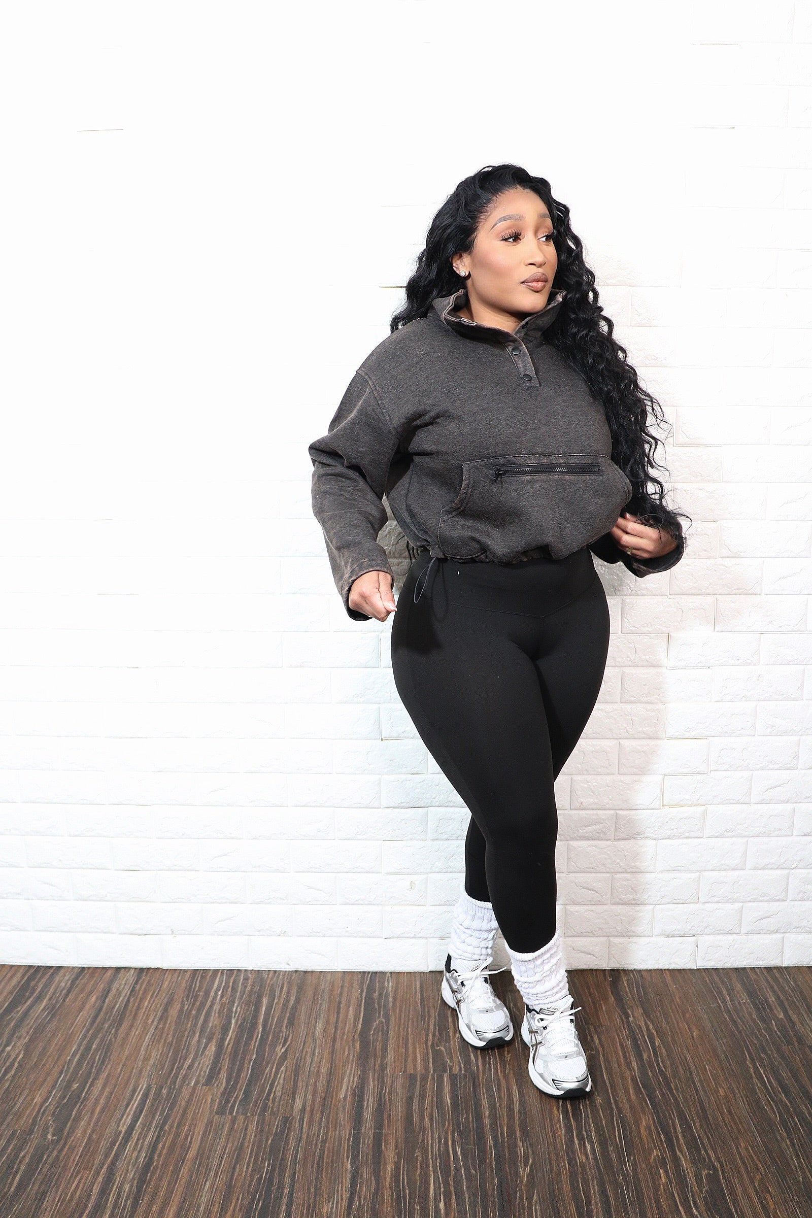 This casual and stylish ensemble features a cozy hoodie paired with high-quality microfiber leggings, perfect for lounging or on-the-go days. The hoodie is designed with a front zip pocket and adjustable drawstrings at the waist, allowing you to customize the fit for added comfort and style. Paired with sleek, stretchy microfiber leggings, this outfit provides exceptional flexibility and a flattering silhouette. Ideal for casual wear, errands, or light workouts, this combination effortlessly blends functionality and fashion. Model wearing Small